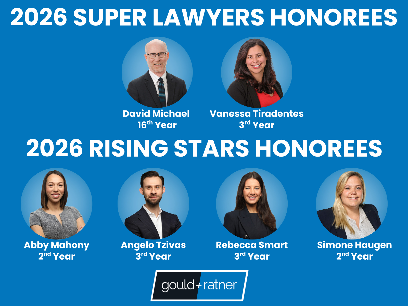 Gould & Ratner is pleased to announce that two attorneys have been selected to the 2026 Illinois Super Lawyers list. Each year, no more than five percent of Illinois lawyers receive this honor. In addition, four attorneys have been named to the 2026 Illinois Rising Stars list, which awards lawyers who are under 40 and practicing fewer than 10 years. No more than 2.5 percent of the lawyers in the state receive this honor each year.